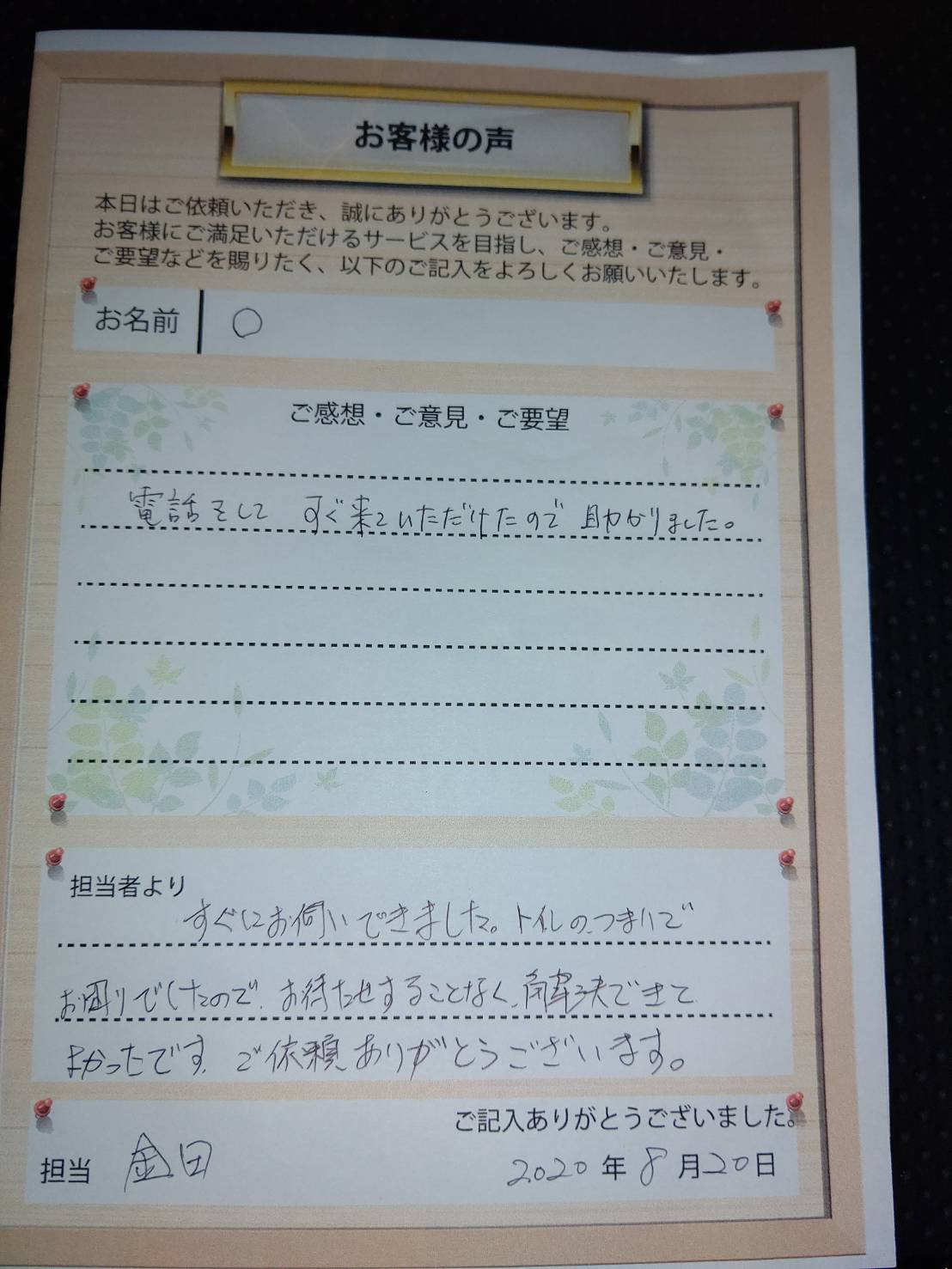 この度はトイレの修理ご依頼ありがとうございました。トイレのトラブルは緊急度が高い為、迅速に対応でき、喜んでいただけて何よりでございました。