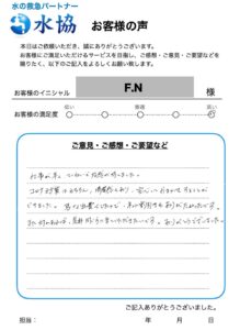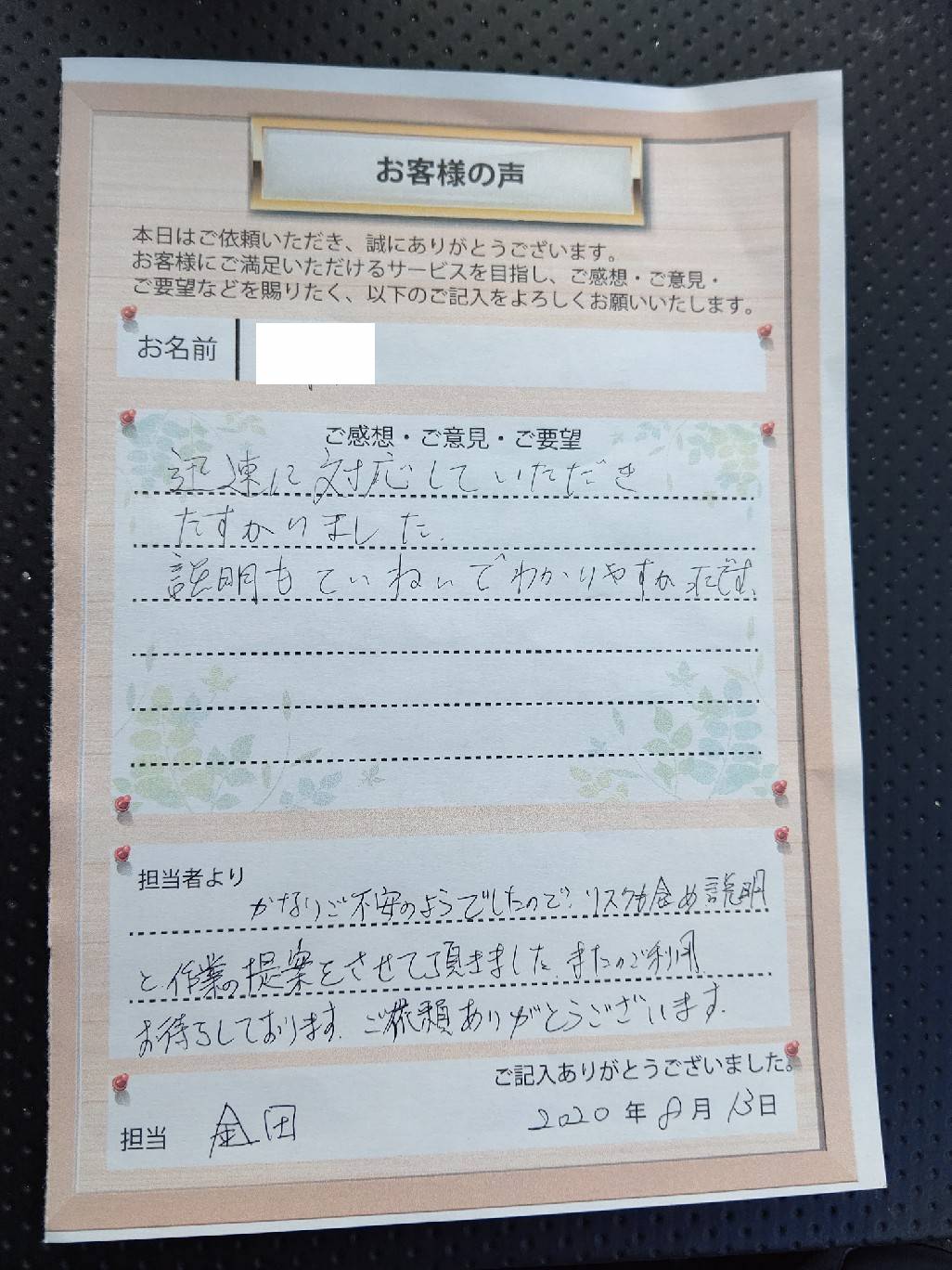 また弊社スタッフの対応にも高評価いただきありがとうございました。もし何かありましたら同じスタッフでお伺いさせていただきますおで、是非ご用命くださいませ!