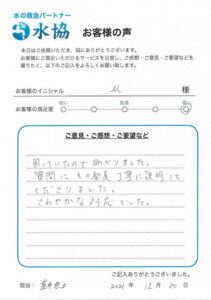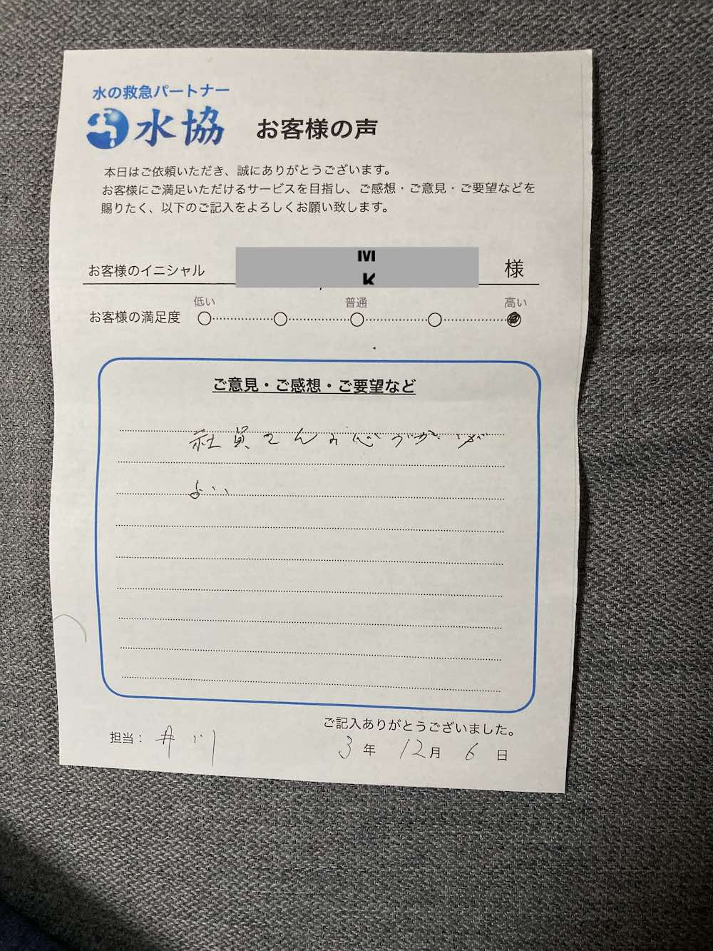 水協では修理技術はもちろん、接客やマナーなどの研修も受けた専属のスタッフがお伺いいたしますので、また何かございましたらいつでも安心してお声掛けくださいませ!